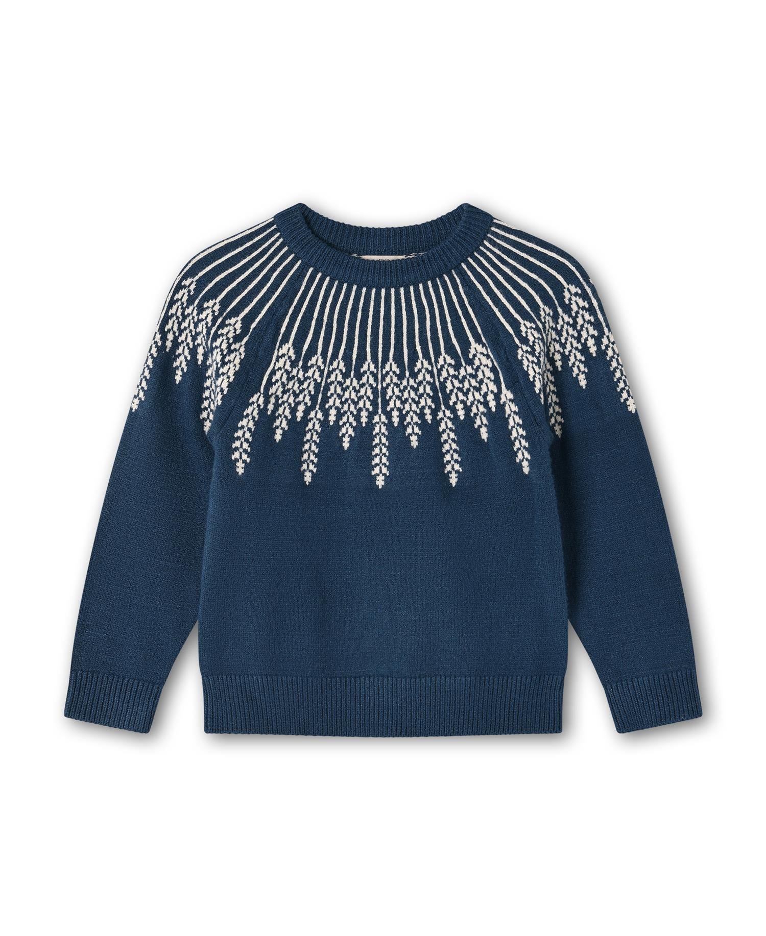 Knitted sweater with a leaf pattern around the neckline. The pullover has raglan sleeves and the fit is comfortable.