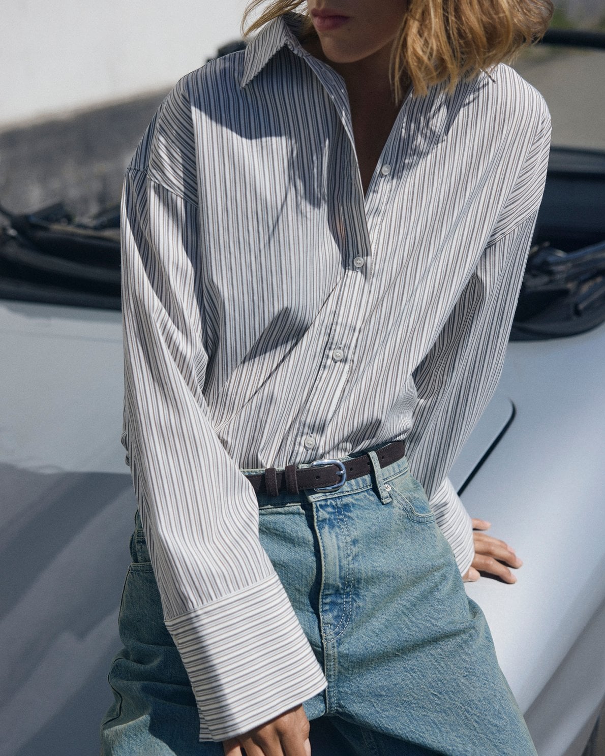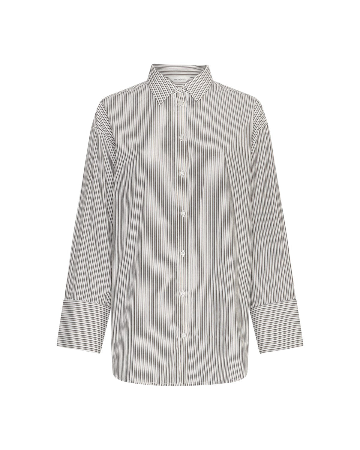 Nydelig oversized skjorte med lodrette striber og knaplukning. Klassisk skjortekrage og lange ermer med manchetter.