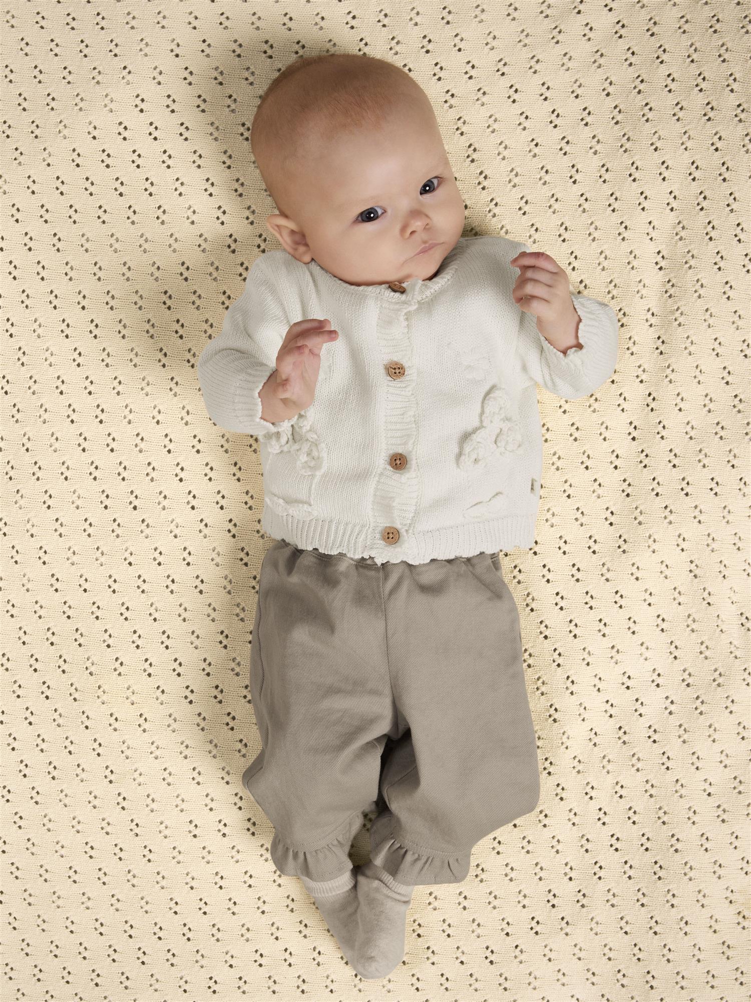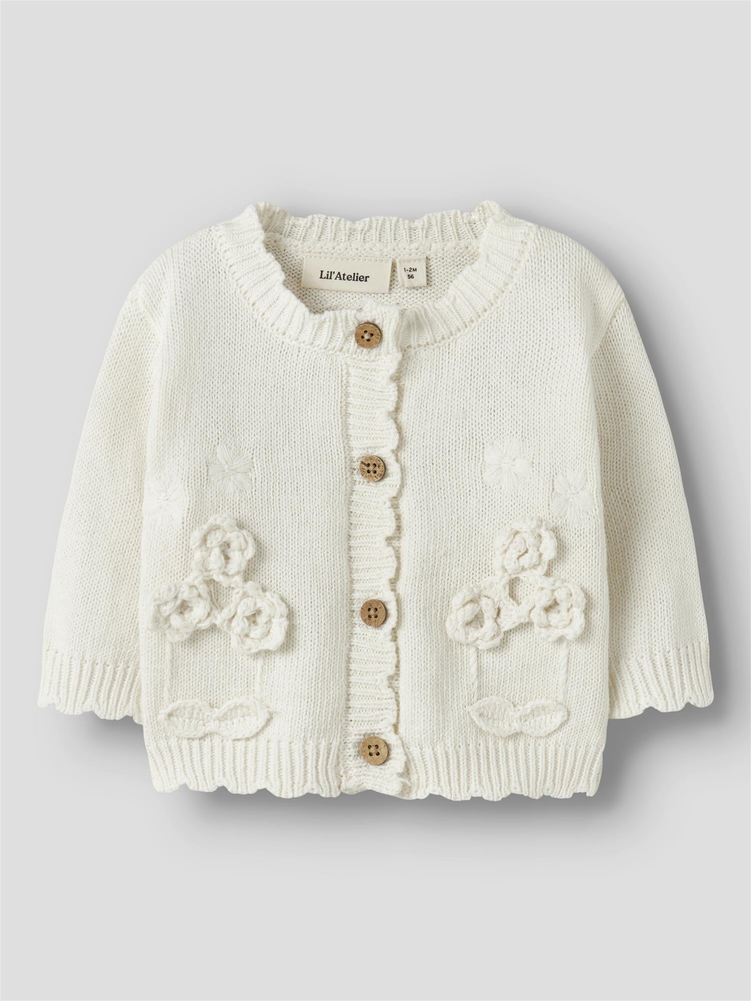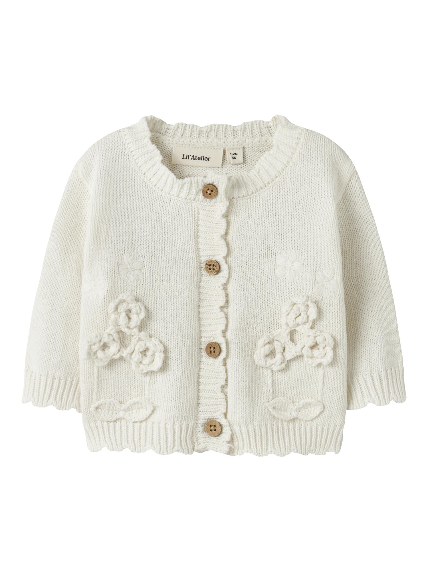Nydelig cardigan fra Lil Atelier i 100% organisk bomull. med søte broderte blomster og påsydde heklede blomster