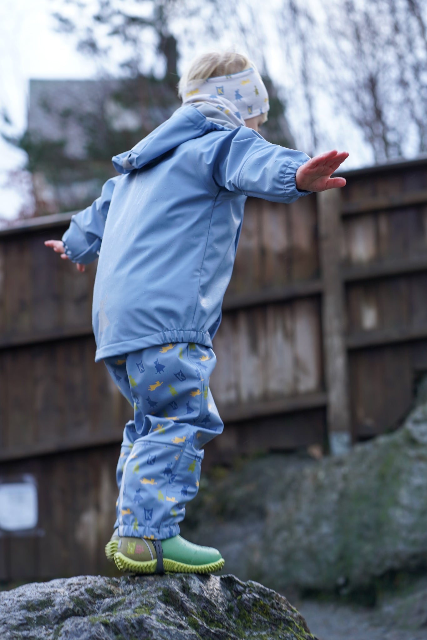 Her er både jakke og bukse i same gode PU kvalitet, med børsta innside. Det er mjuk fleece på insida av kragen og vannstopper finst i både ermer og bein. Her har me slitesterk gummistrikk under føtene, refleksar på jakke og bukse, og mykje moro i print og andre detaljar. Sveisa saumar og sikker hette som er både avtagbar og regulerbar.