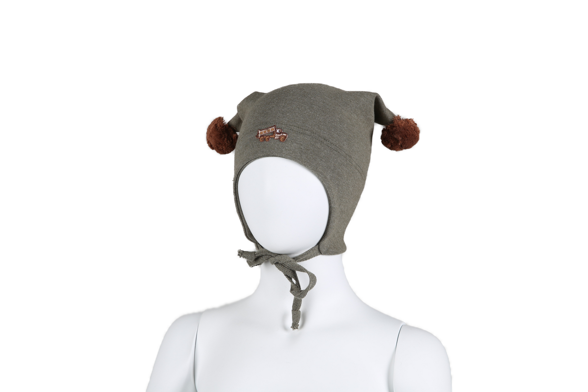 Nydelig bomullslue med kivat merke og dusker. Har vindstoppere i sidene og tøff lastebil.